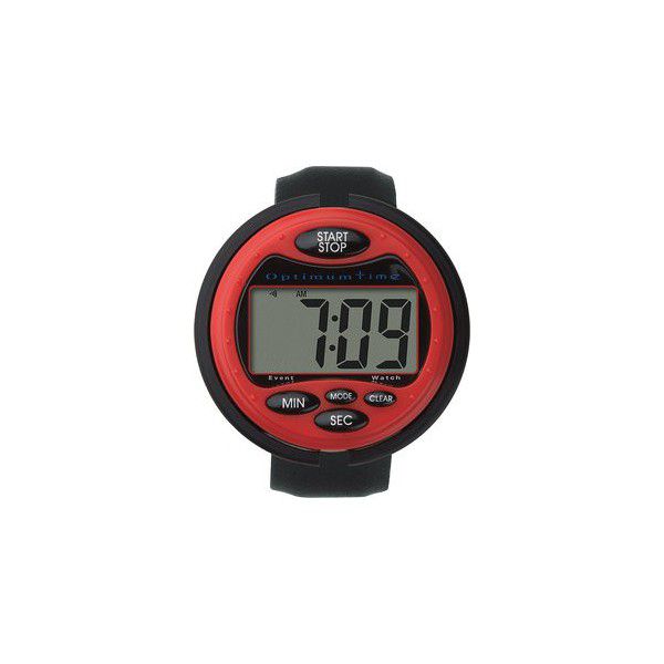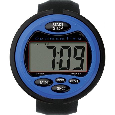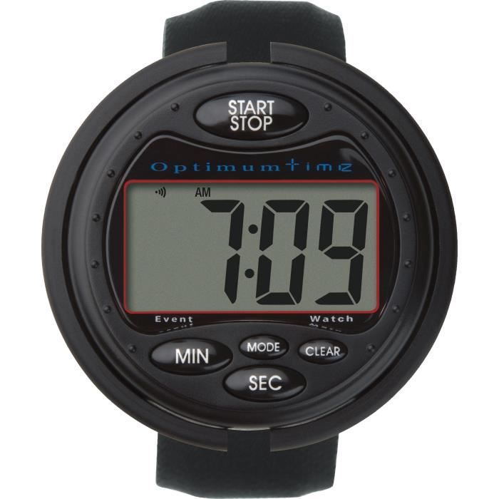 Le chronomètre optimum time est imperméable. Il est équipé d'une montre, d'un chronomètre (à partir de 0), compte-minutes avec alarme et compte à rebours programmé à alarme. Ranger à l'abri de l'humidité.