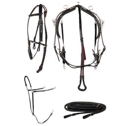 Harnais QH complet. Bon marché et spécialement conçu pour un entraînement récréatif. Il est entièrement en cuir. Le set complet comprend une sellette en cuir QH, une sangle en caoutchouc, une lanière de croupière en cuir, une bricole cuir en forme de Y, des guides en cuir noir, une bride et un enrênement en cuir, une sous-barbe et les courroies de sécurité QH.