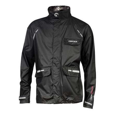 Ensemble composé d'une veste et d'un pantalon de pluie en polyuréthane. La veste est équipée d'un col relevé et de manches raglan pour une liberté de mouvement des bras. Cordon de serrage à la taille de la veste, poche poitrine et deux poches basses. Cordon de serrage à la taille du pantalon et des fermetures éclair latérales au niveau des mollets. Plusieurs motifs réfléchissants.